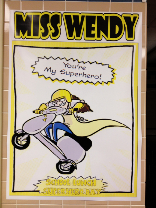 Being a superhero is pretty darn cool. May 3rd was School Lunch Superhero day and we were treated to some really cool cafeteria decorations, thank you notes and even a dance number. My favorite were the notes depicting my hairnet.